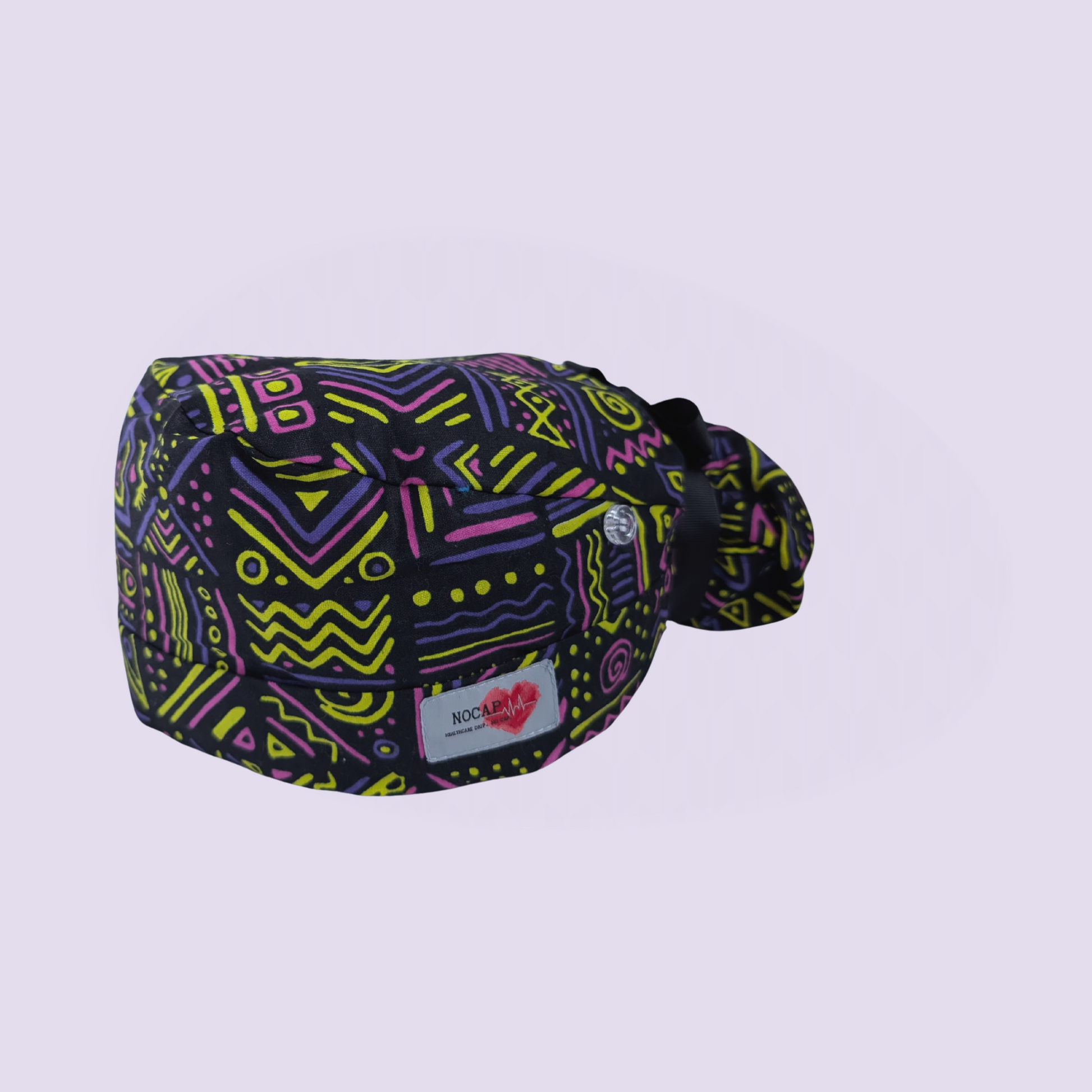 A handcrafted African print scrub cap designed for comfort, confidence, and everyday wear. Available in Ponytail and Tie-Back styles.